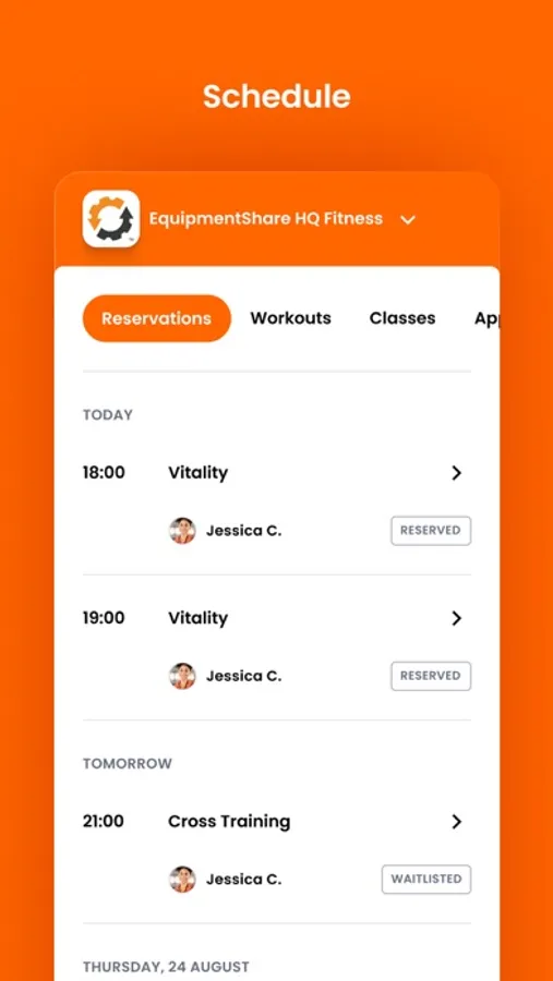 For members of EquipmentShare HQ Fitness to reserve their place in a class, sign up for gym events, and general account management like updating headshots and credit card on file.