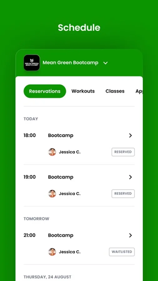 For members of Mean Green Bootcamp to reserve their place in a class, sign up for gym events, and general account management like updating headshots and credit card on file.