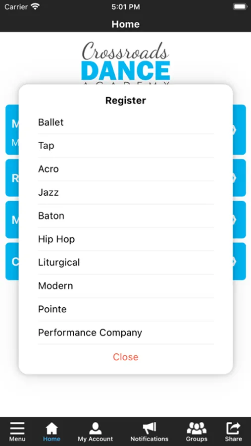 The Crossroads Dance Academy app allows you to manage your account with ease, register for classes, and special events. You'll also receive important notifications about class changes, closings, registration openings, special announcements, and upcoming events.