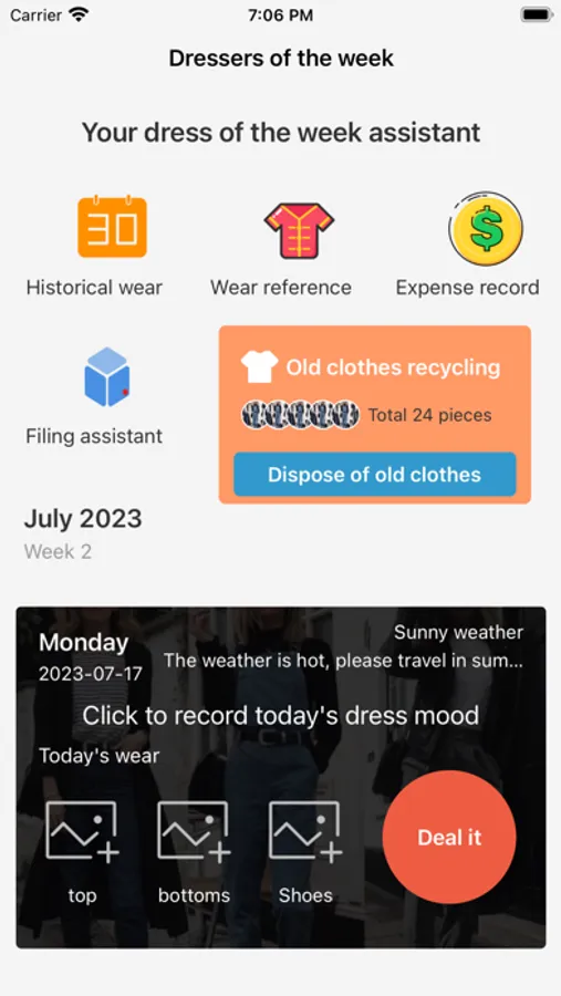 Dressers of the week is a solution to your weekly dress planning problem, you do not know what to wear every day, here you can plan a week in advance, we recommend and record your daily wear, record the cost of wearing, so that you can achieve both worry and save money to wear every day, a week wear here waiting for you oh