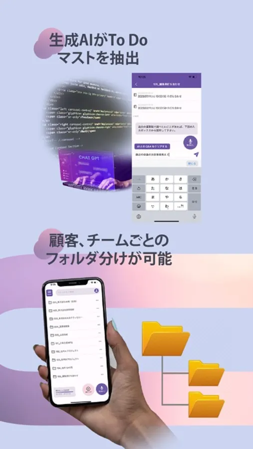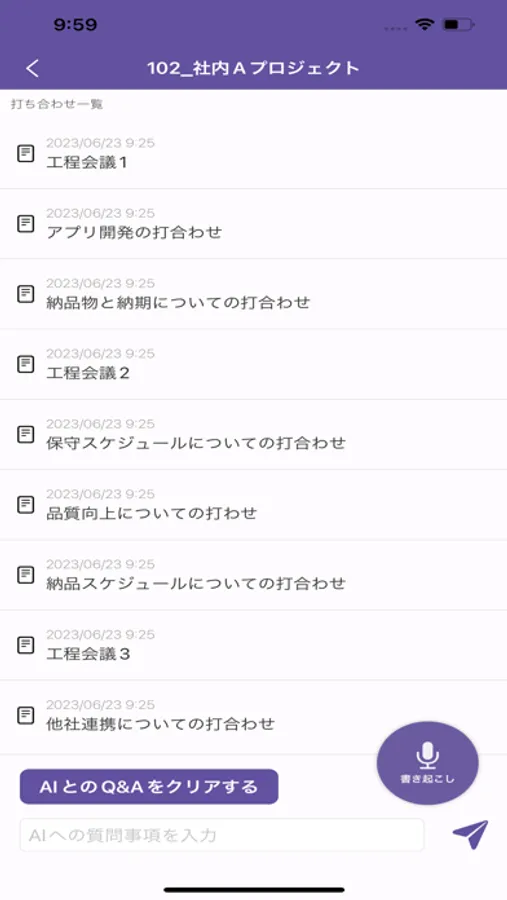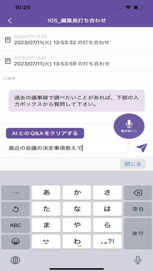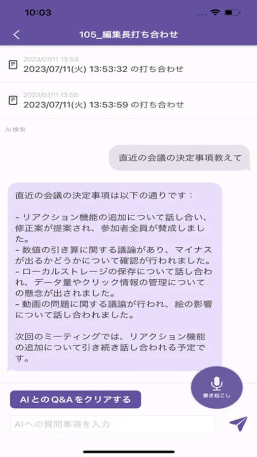 フォルダごと・打合せごとに過去の会議データに対してAI検索をかけられるので「○○日の会議の決定事項を教えて」と入力すれば、すぐにAIが回答を返してくれます。実際の会議の内容であればどんなことだって返答するので、当アプリが頼もしいパートナーになってくること間違いなし。