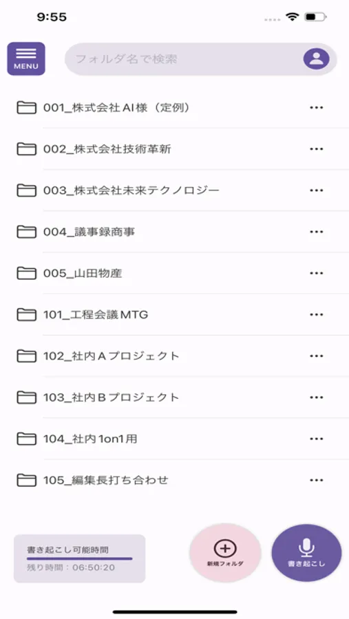 打合せデータは自由に作成できるフォルダ内に管理できます。例えば「顧客Aフォルダ」「取引先Bフォルダ」「社内Cチームフォルダ」のように分けて、それぞれで会議データを保存していくことができ、データの管理が容易になっています。議事録を探すコストも抑えられます。