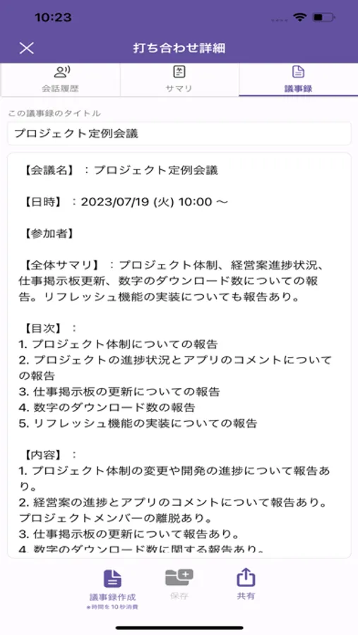 打合せが始まれば、自動で音声データをリアルタイムでテキストに書き起こします。そして書き起こされたテキストは自動で要約。さらに議事録作成もワンタップで可能!AIの力で、精度の高い書起こし・要約・議事録作成を実現しています。これで議事録作成の手間もコストも削減!省人化で企業にとって十分な恩恵を。