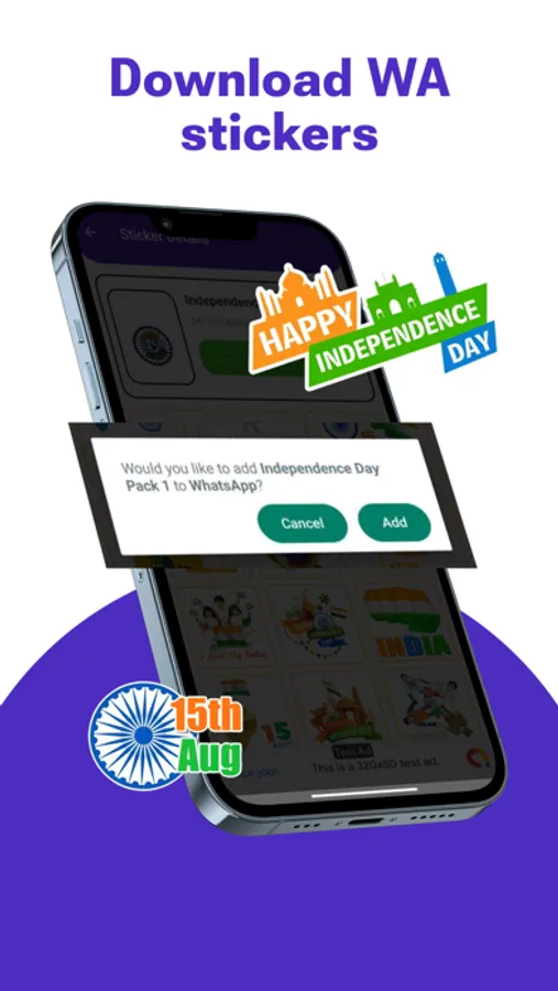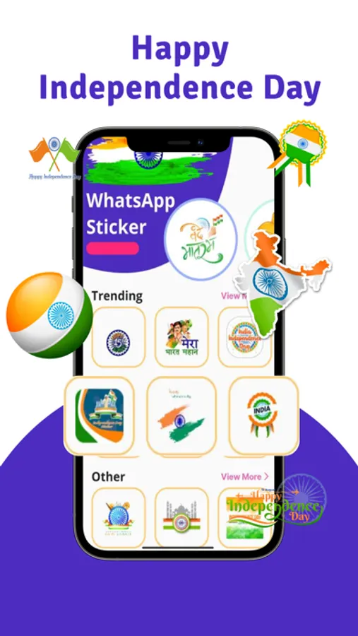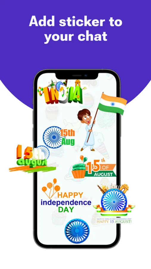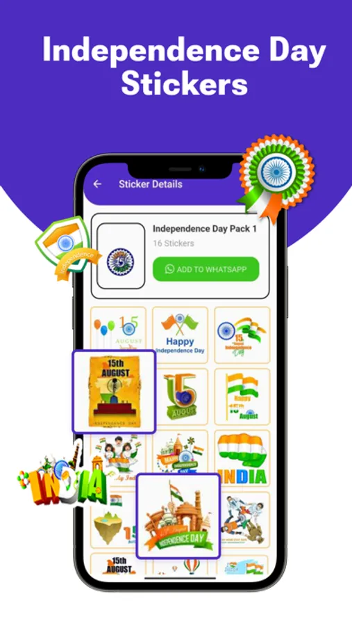 The Independence Day Stickers app contains various stickers like Happy Independence Day 15 August 2023, India, Indian Flag, Bharat Maa Ashoka Chakra, Hindi Animated, Indian Flag Letter Text Sticker, Bharat Ma Stickers, Republic Day stickers