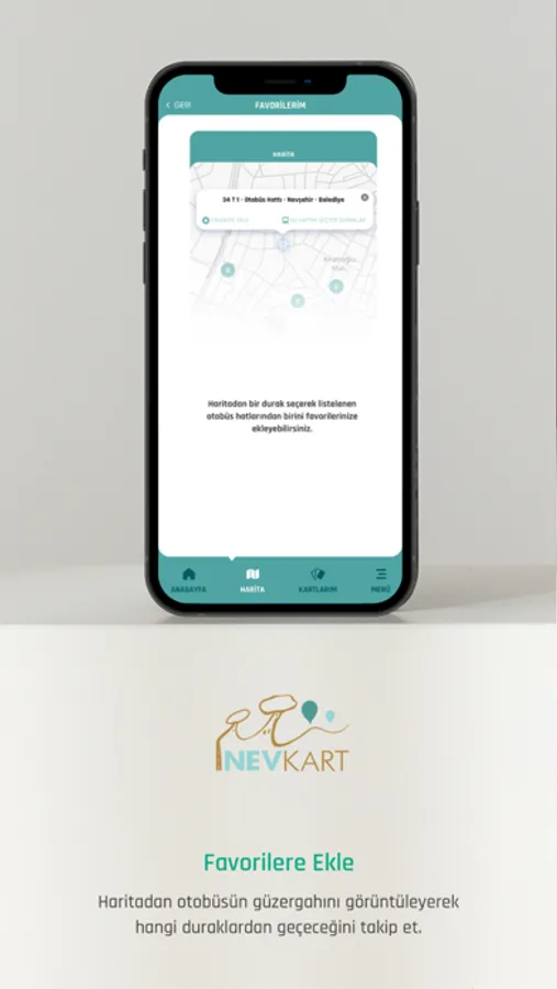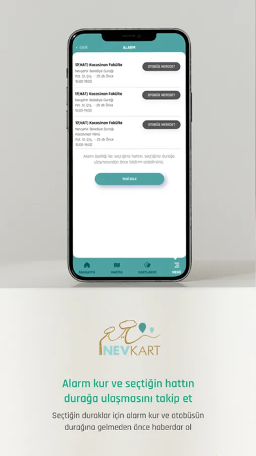 NevKart uygulaması ile haritadan çevrenizdeki durakları görebilir, otobüsünüzün ne kadar süre içerisinde geleceğini takip edebilir ve duraktan geçen hatları izleyebilirsiniz. Durakları ve hatları favorilerinize ekleyebilir, otobüs geliş saatlerine göre alarm kurabilir ve otobüsünüz istediğiniz durağa yaklaşmadan önce bildirim alabilirsiniz.