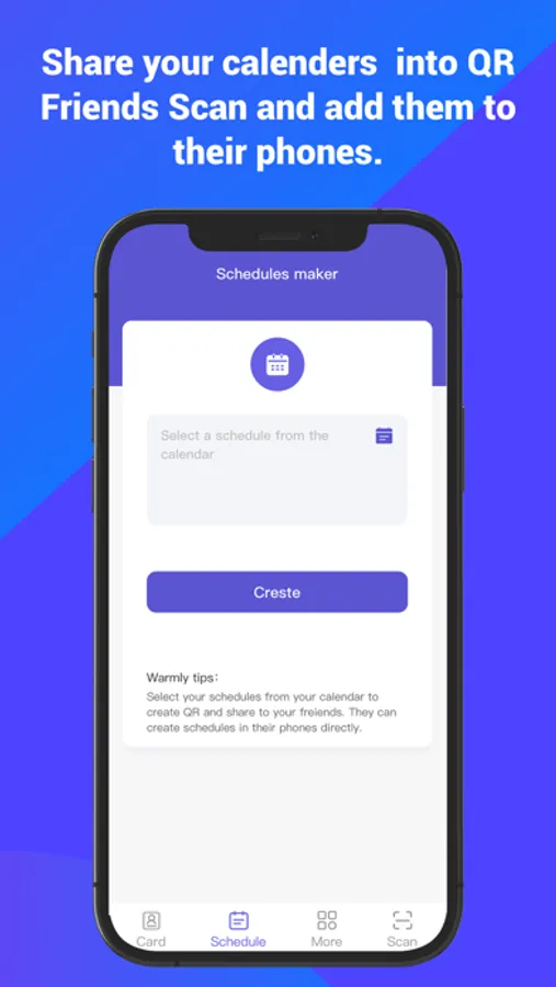 If you have great schedules, generate a QR code for them. Your friends scan this QR code and can add your schedule to their cell phones. Both you and your friend will get a reminder on the date of your schedule, so you don't miss out on a great shared experience.