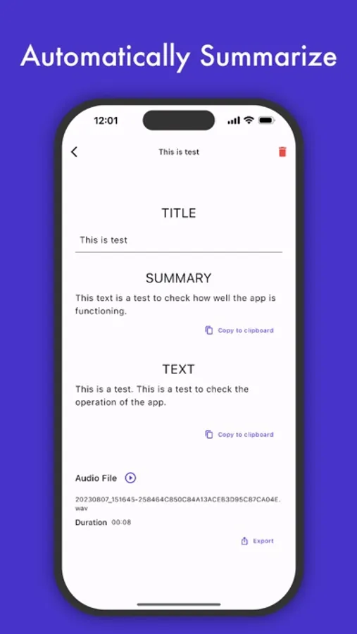 VoiceTranscribe automatically summarizes your dictated text. This not only saves you time, but also helps you grasp the essence of the information.