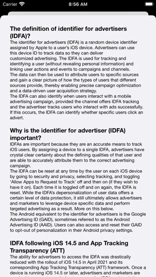 IDFAs are important because they are an accurate means to track iOS users. By assigning a device to a single IDFA, advertisers have crystal clear certainty about the defining qualities of that user and are able to accurately attribute them to the correct advertising campaign.