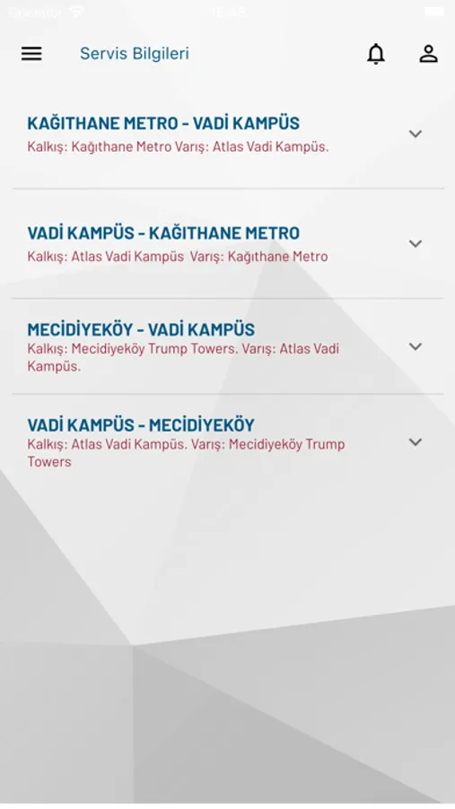 Kullanıcılar servis saatlerini ve yemek menüsünü görüntüler.