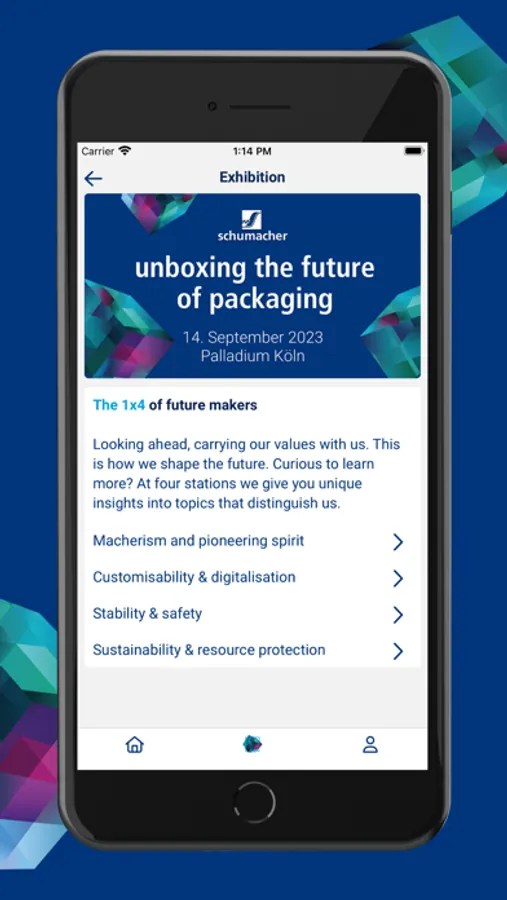 Welcome to the world of the future of packaging. The app is your mobile companion for Schumacher Packaging Group events. Within you will find information on current topics, answers to organisational questions, exciting insights into the world of our products and company as well as virtual exhibitions.