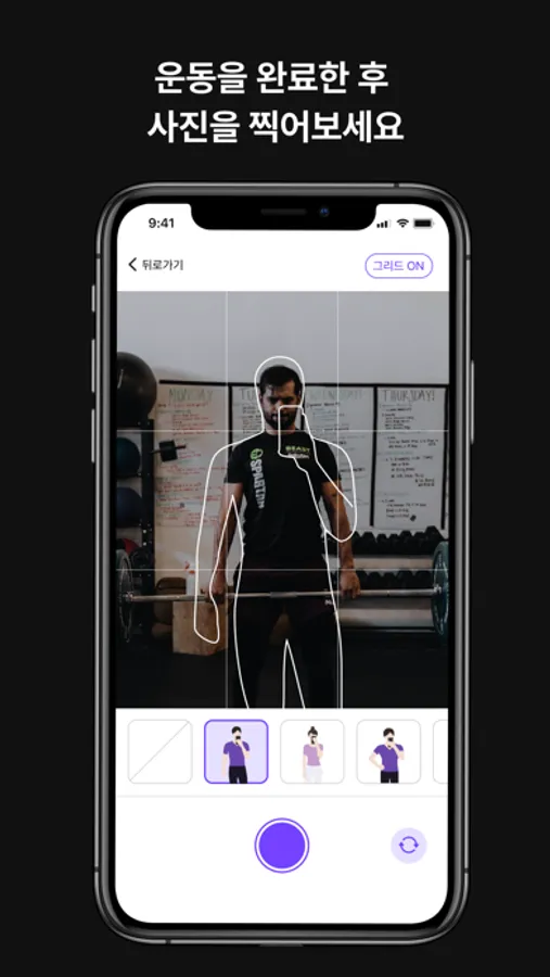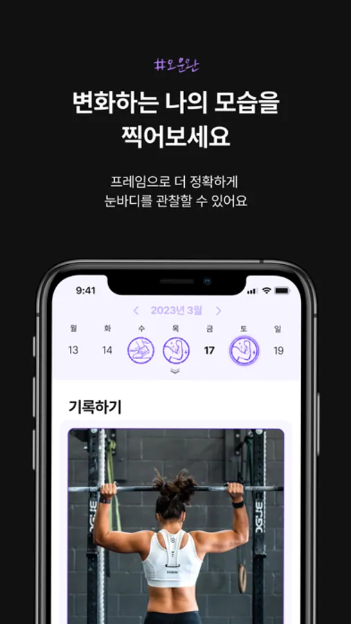 - 프레임에 맞는 사진을 찍거나 갤러리에서 오운완 사진을 가져와 매일 기록을 할 수 있습니다.
