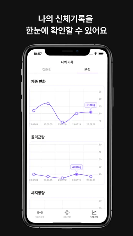 - 사진을 한 눈에 모아볼 수 있고 몸무게, 골격근량, 체지방량은 차트로 쉽게 변화를 파악할 수 있습니다.