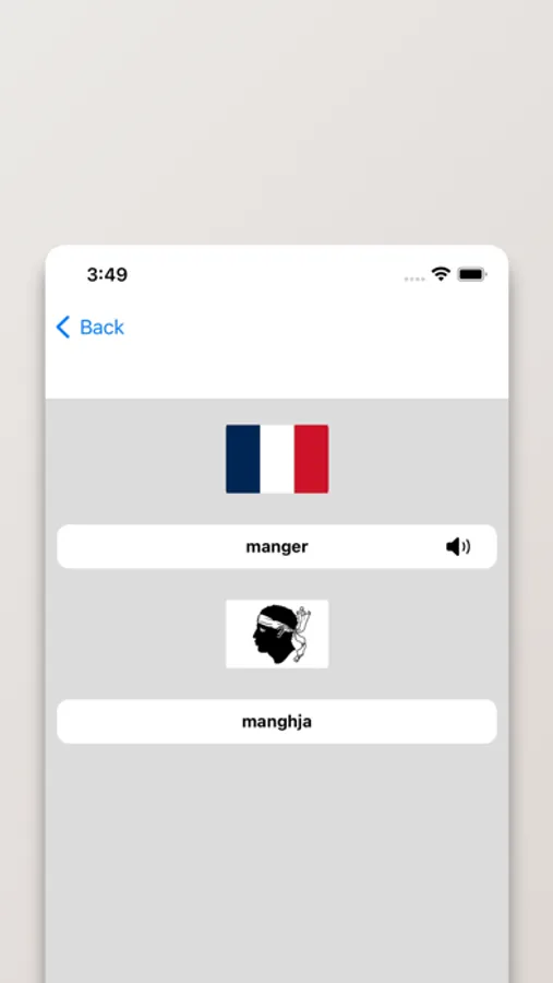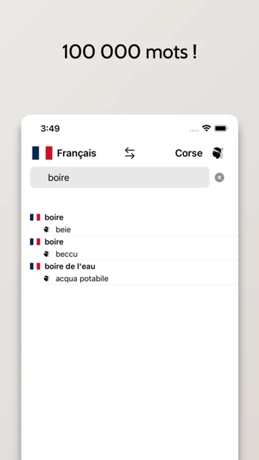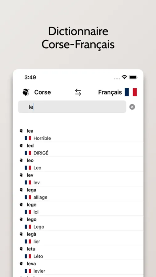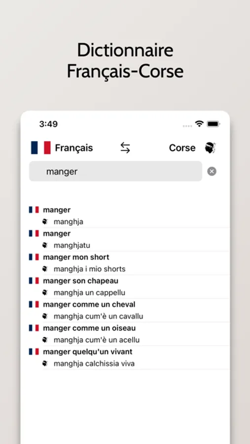 - Possibilité de rechercher à partir de mots en Français ou en Corse