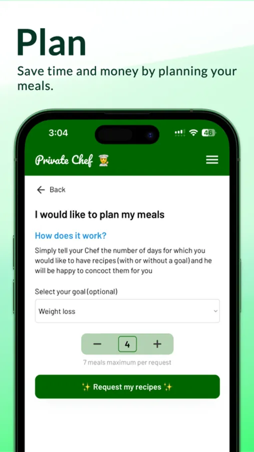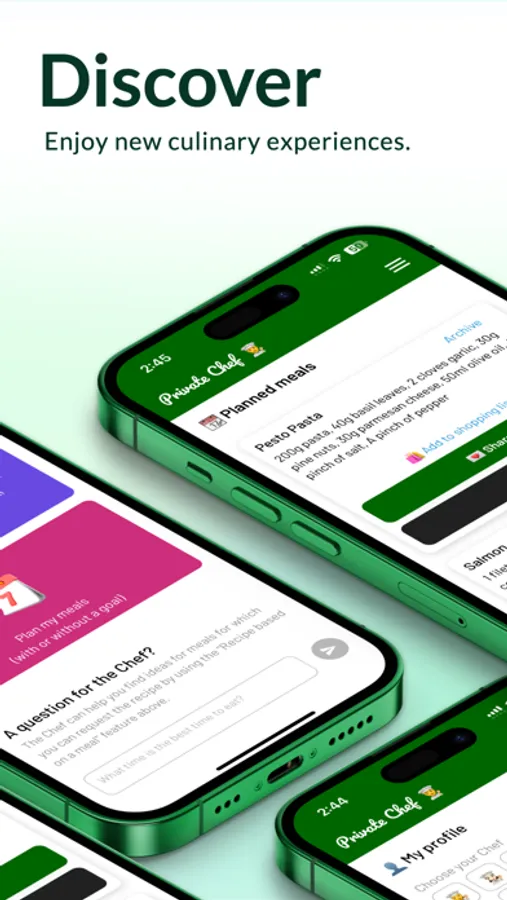 But Private Chef is more than just a recipe application. You can also chat with your Private Chef and ask questions about cooking. What's more, thanks to our meal planning feature, you can organize your menus for several days in advance and avoid last-minute choices.