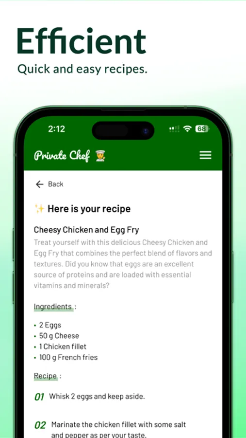 With Private Chef, the days of searching for recipes to suit your ingredients or spending time planning your menus for the week are over. Our application offers you personalized recipes based on the ingredients you have available and your dietary preferences. In just one click, Private Chef creates your shopping list based on the recipes you've selected.