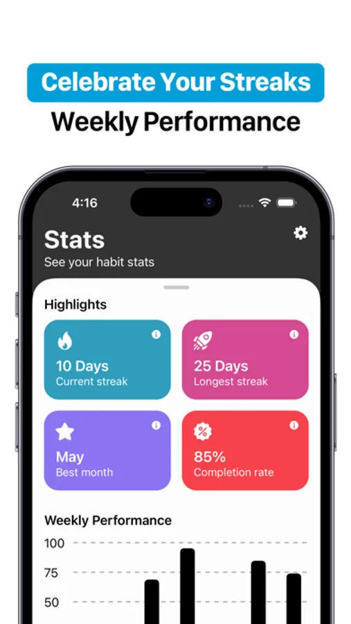 Celebrate your streaks and track your weekly performance with ease. The app highlights your accomplishments, helping you stay consistent and motivated. Watch as your progress builds and unlock new levels of success.