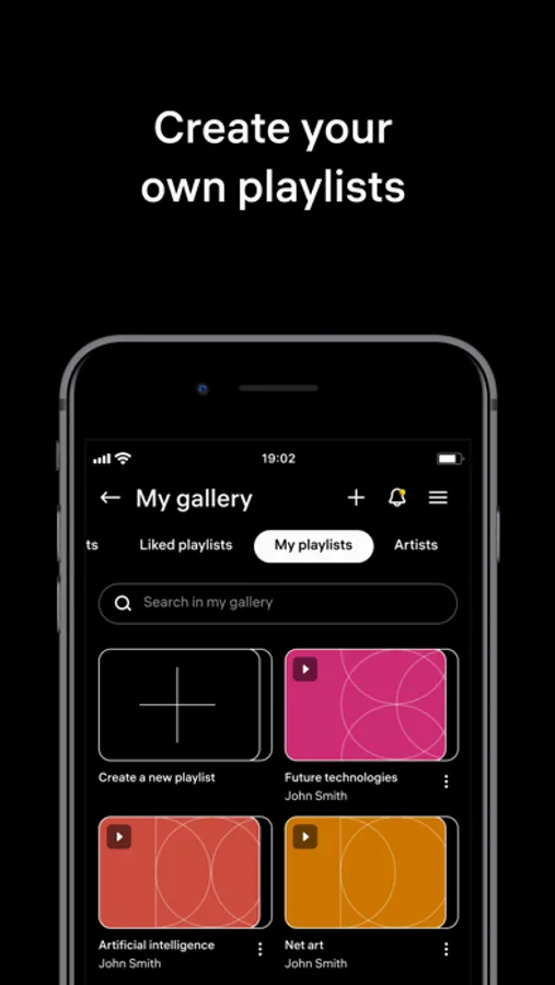 Create and curate your own digital space: with one click, the artworks can be composed into thematic playlists. Mirror your inner world through art, and find like-minded creators.