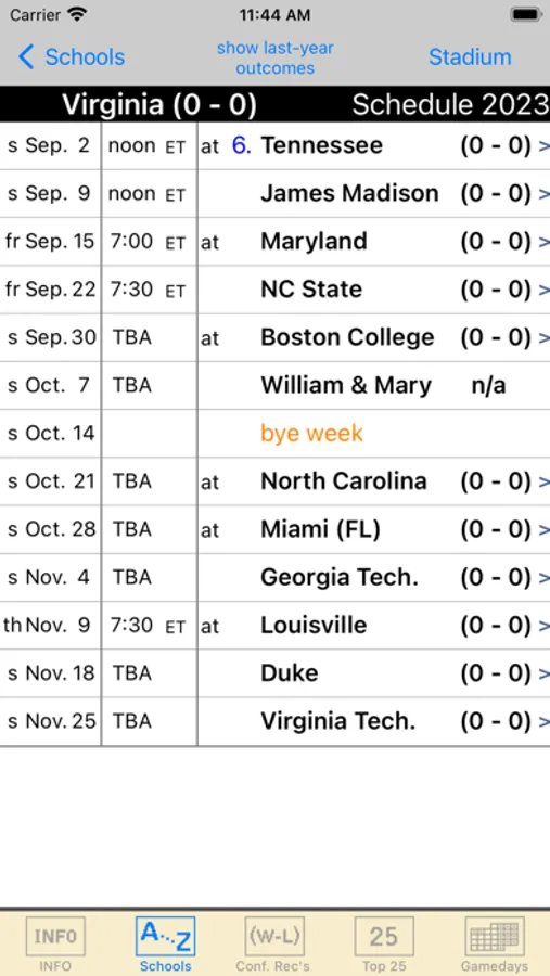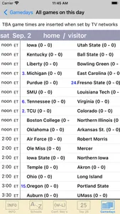For all 133 FBS college football teams. Following-up on last-season's near 5-star rating, this season's "Gridiron 2023” is just as good. Live scores for underway games compiled every minute throughout gamedays (if web connected). This app is cleverly designed to not depend upon a persistent network connection. Final-scores verified and updated throughout gamedays for schedule coloring. The app even includes last-year's results to remind us.