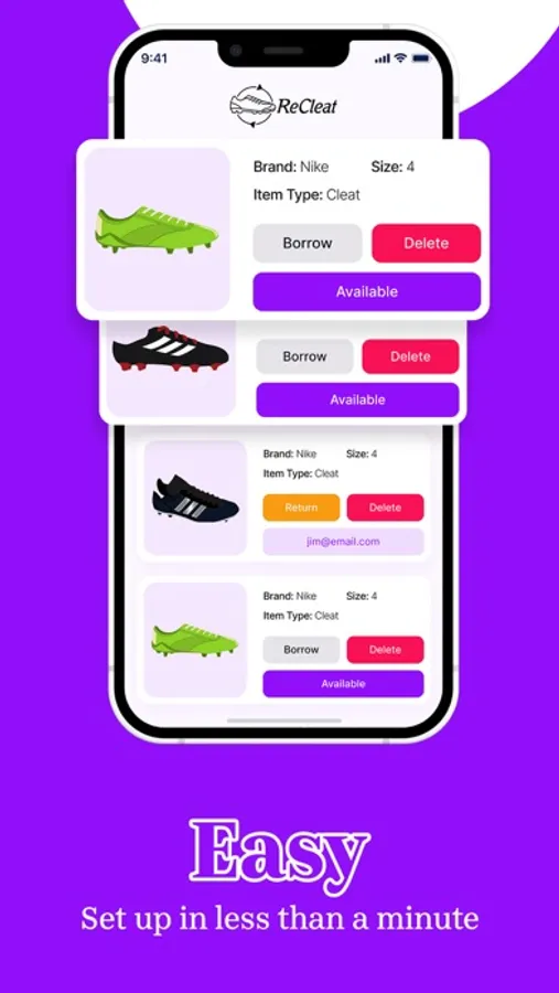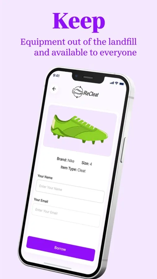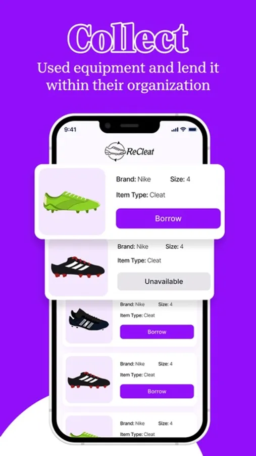 ReCleat allows schools/clubs/teams to collect used equipment and lend it within their organization. At the end of the season, teams collect equipment players will grow out of, and relend it to next years team; saving money and keeping equipment out of the landfill.