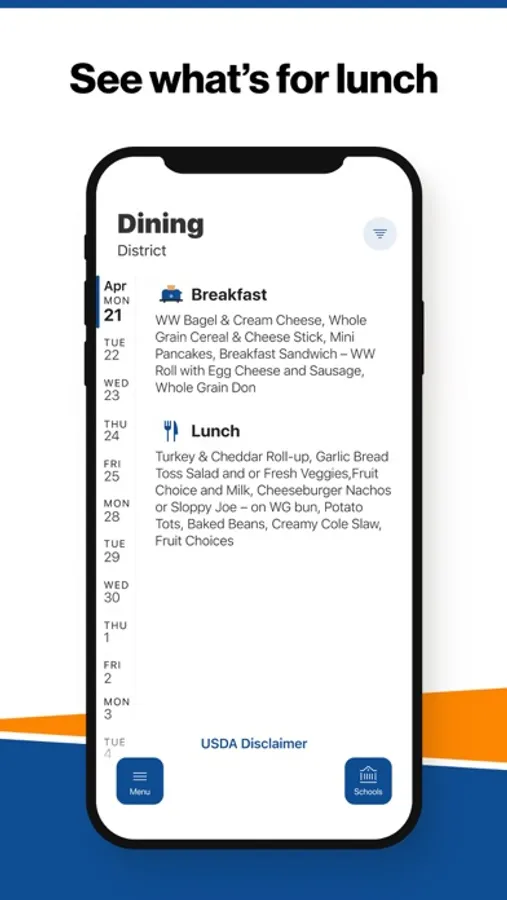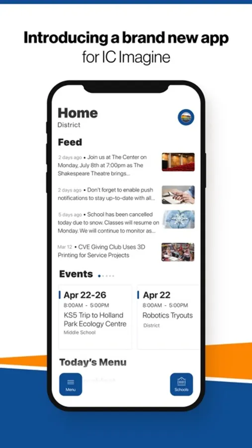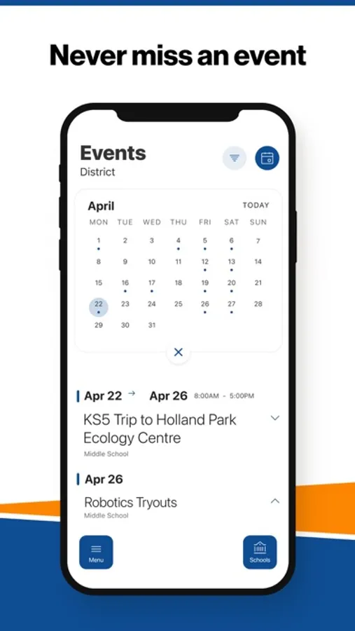 The event section shows a list of events throughout the school. Users can add an event to their calendar to share the event with friends and family with one tap.