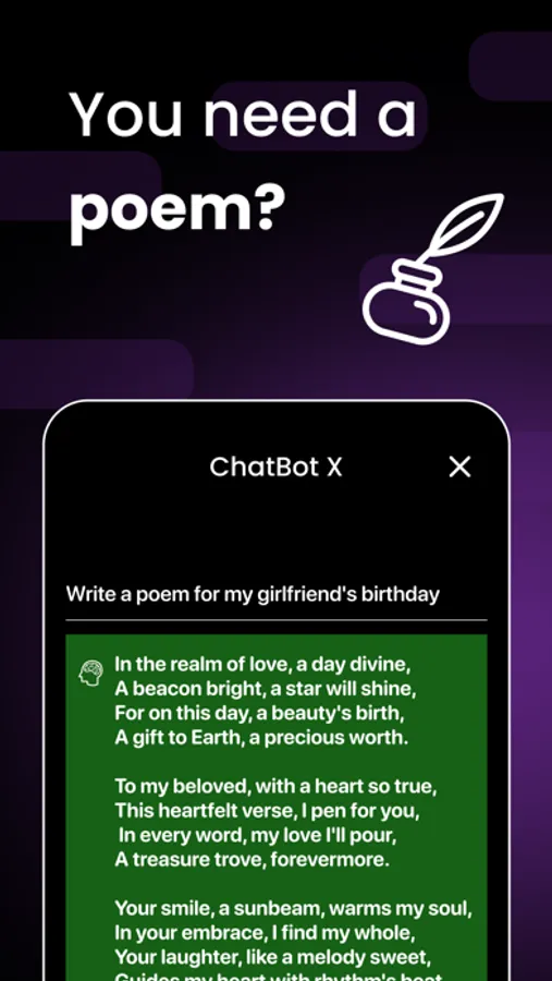 Engage in dynamic conversations with our intelligent chatbot that adapts to your needs. From answering your questions to providing personalized assistance, our ChatBot X is your virtual companion. Whether you're seeking information, support, or simply want to chat, our app is here for you 24/7.