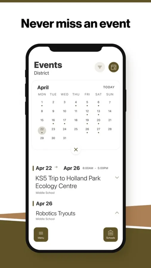 The event section shows a list of events throughout the district. Users can add an event to their calendar to share the event with friends and family with one tap.