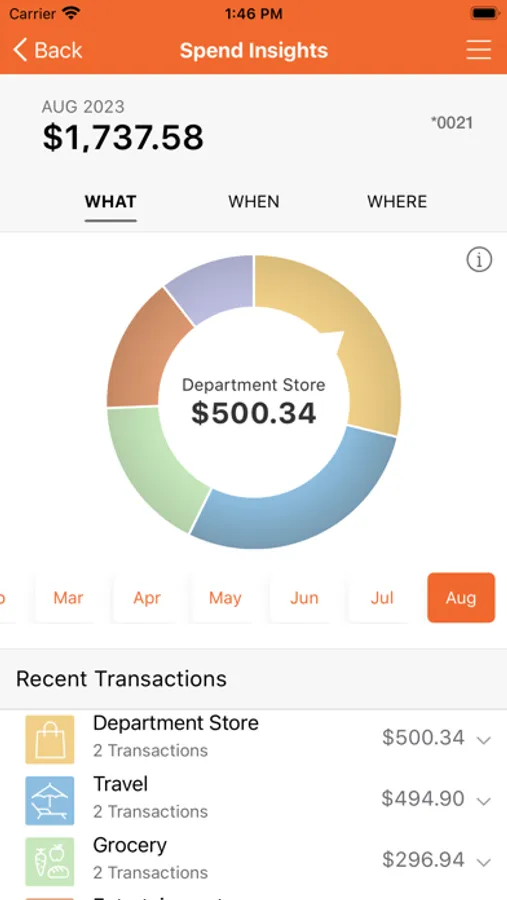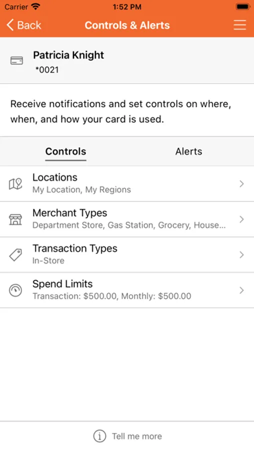 Set spending limits to decline transactions above your thresholds. Monitor activity by category such as gas stations and restaurants, and by type: in-store purchases, e-commerce transactions and ATM transactions.