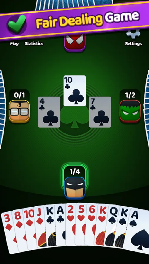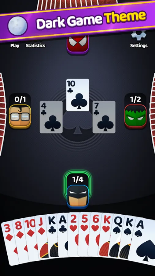 Challenge yourself with the strategic gameplay of Spades, where bidding, trumping, and clever card play are keys to victory. Engage in exciting battles against brilliant AI opponents, each with their own unique playing style. Sharpen your skills, anticipate your opponents' moves, and outwit them to claim victory!