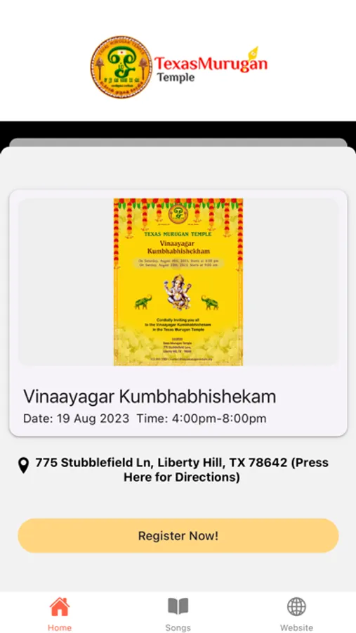 Welcome to the Texas Murugan Temple Mobile App! Get instant information about our temple events and other initiatives. Also, devote yourself to Lord Muruga by singing your favorite Murugan songs, with on-app lyrics.