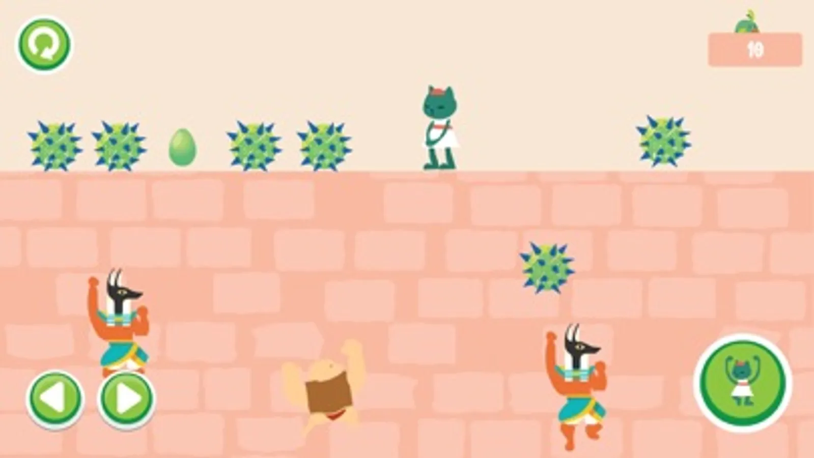 You are a warrior guarding the ancient tombs of the pharaonic empire, there are many robbers who are trying to climb inside the ancient tomb to steal rare objects, pick up the thorns and throw them down, the gods will help you. Help you by letting the bird fly over and lay an egg containing the energy of the gods, after absorbing the egg punch the ground hard for all the bandits to fall.
