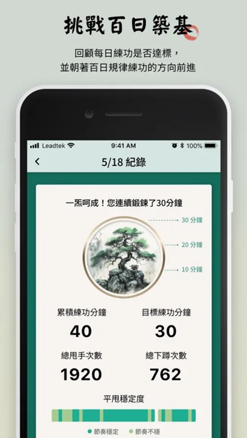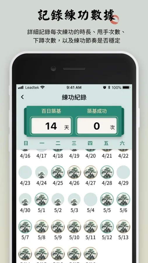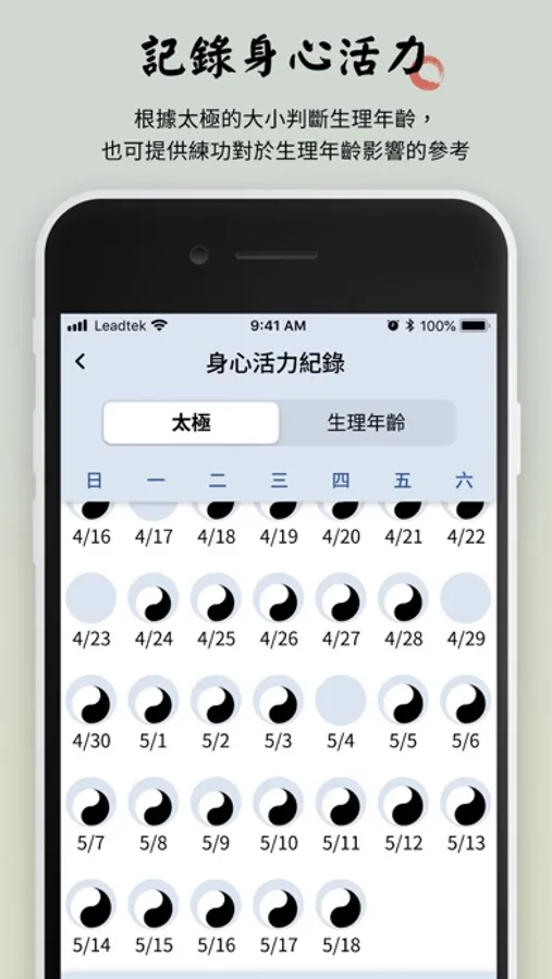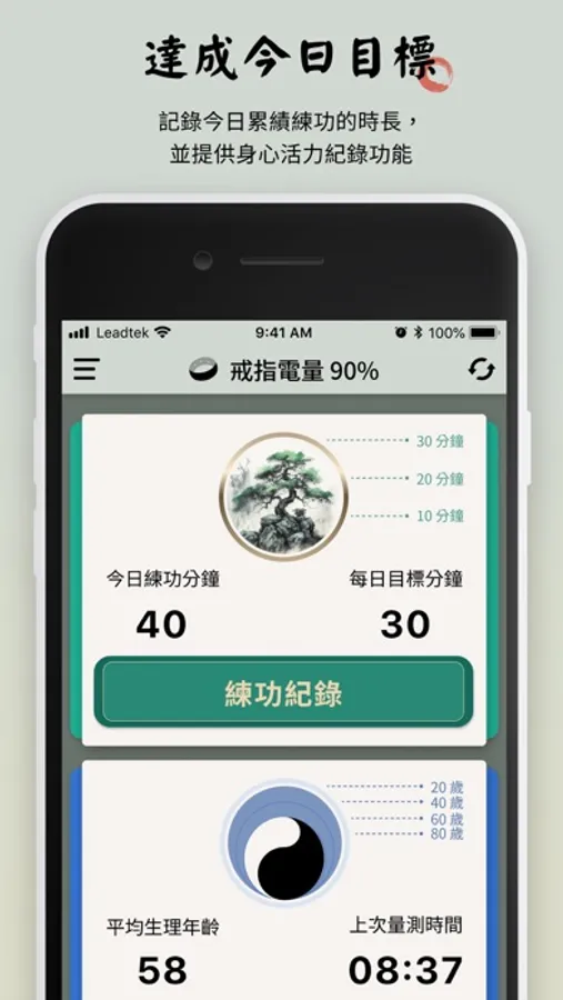 利用 amor RingSwing 除了可以記錄練功的時間還有每日練功的目標,同時提供身心活力記錄功能。其中練功的詳細參數包括: 練功的時間、甩手次數、下蹲次數,以及練功的節奏是否規律。在練功部分,根據樹的大小來判斷是否有達到每日目標,並朝著百日築基的方向前進。在身心活力部分,根據太極的大小來判斷生理年齡的大小,也可以提供練功對於生理年齡影響的參考。