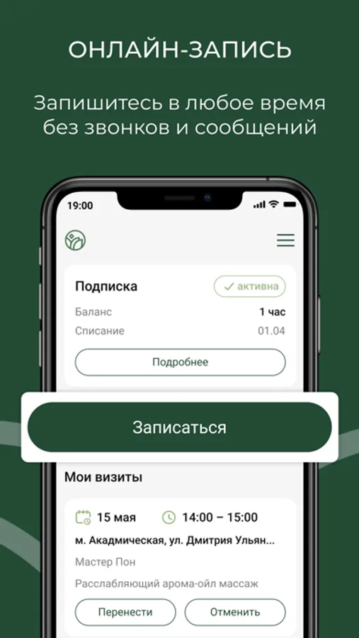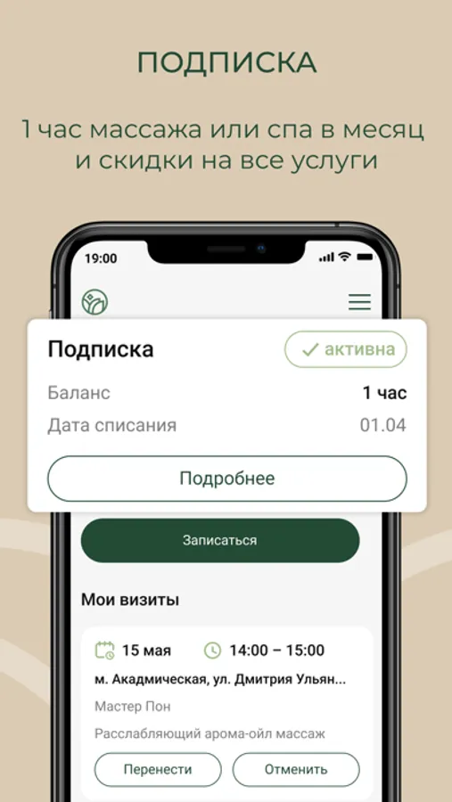 Подключить подписку можно только через приложение. По ней вы получите 1 час массажа или спа в месяц и скидки на все услуги. Подпиской легко управлять, а баланс и дату списания можно посмотреть на главной странице.