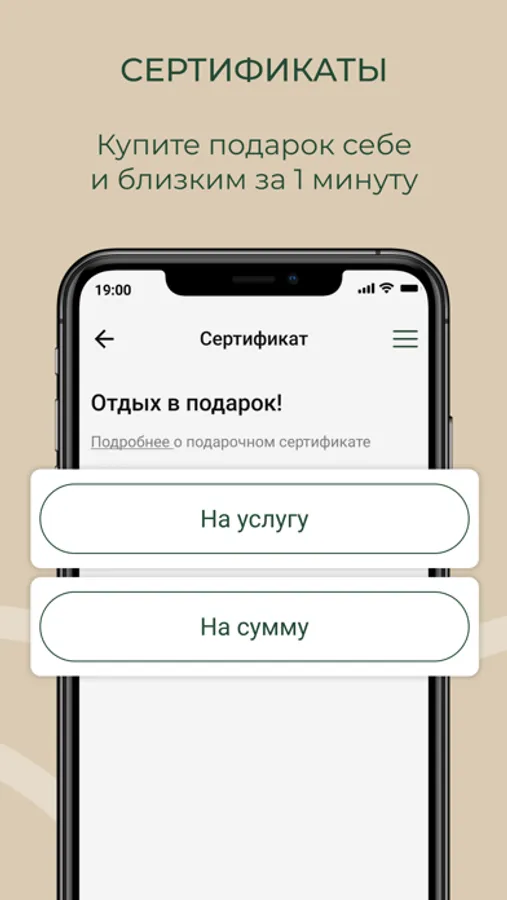 Вы можете в любой момент подарить отдых себе и своим близким: в приложении можно купить подарочный сертификат как на сумму, так и на любую услугу.