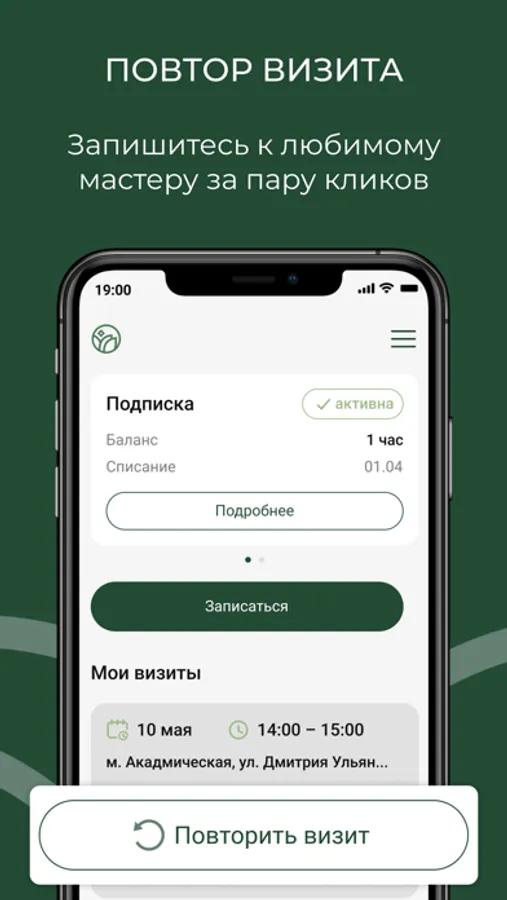 На главной странице вы увидите историю своих визитов и сможете записаться к любимому мастеру еще раз за пару кликов.