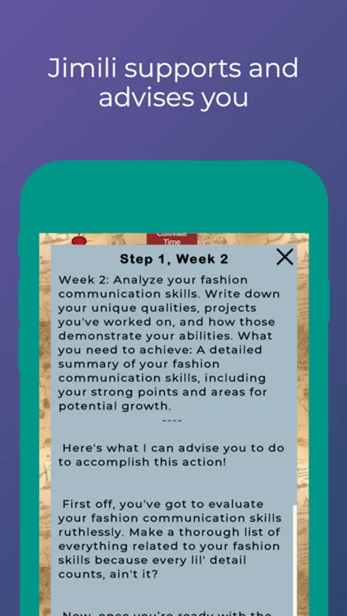 Jimili is not just an application, it's a real life companion. With its simple and engaging language, Jimili motivates you, inspires you, and helps you stay focused on your goals. Each step of your journey is divided into daily or weekly actions, adapted to your pace and preferences.