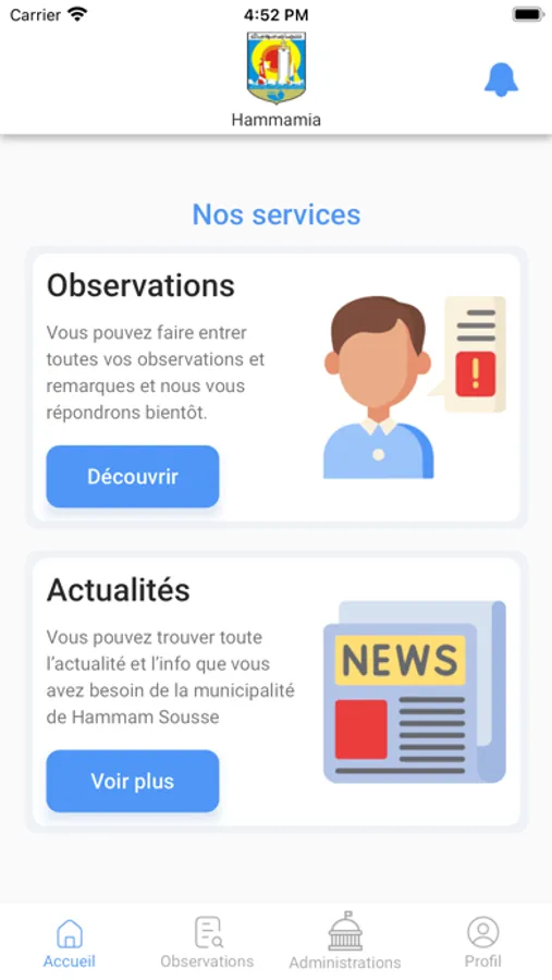 Hammamia est constituée d'une plateforme web et mobile destinée aux citoyens d'Hammam Sousse. Elle représente une solution performante et rapide pour la création et l'envoi instantané des remarques et des observations a la municipalité. Sans perdre du temps et d'effort, les citoyens peuvent bénéficier des services de la municipalité tout en recevant les réponses nécessaires.
