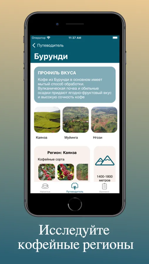 Также, приложение позволяет погрузиться в мир кофейного разнообразия и познакомит Вас с различными кофейными регионами, расскажет об особенностях кофе этих регионов и опишет основной вкусовой профиль каждого из них. Если Вы хотите ощутить уникальный вкусовой профиль понравившегося Вам кофе, приложение также подберет для Вас подходящие блюда.