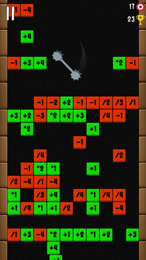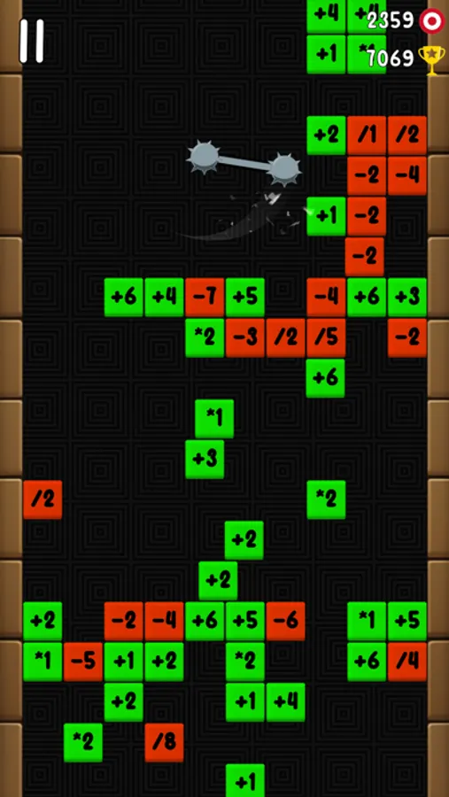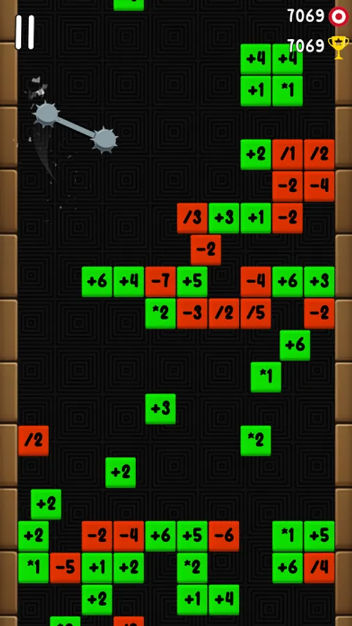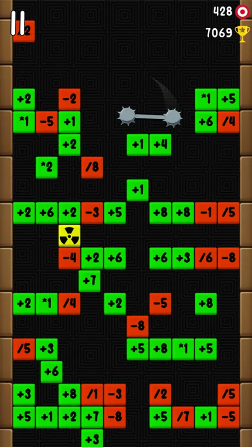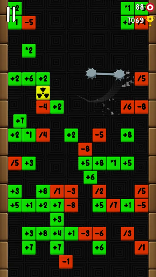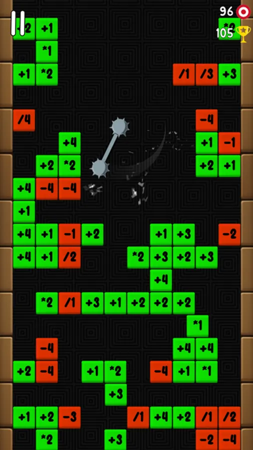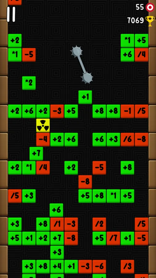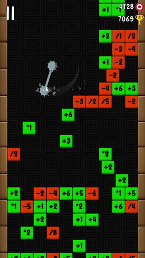 Tap on the screen to switch which wrecking ball will swing. Break the green tiles to increase the score. If you hit the red tiles it will decrease your score. If the score falls beyond 0, the game is over. Radioactive tile will instantly destroy the wrecking ball and the game is over. The game is endless and your only goal is to score as much as you can.