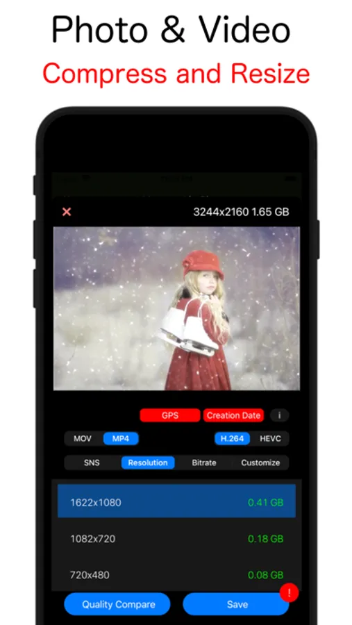 3. Select the format to save (MP4, MOV), decide the output size, and tap "Save" to save the video.
