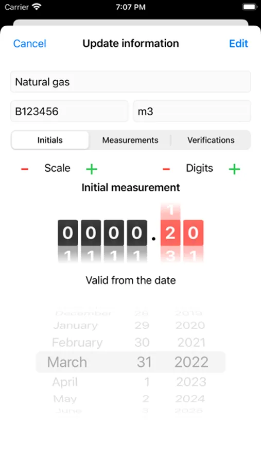 - Each meter contains a name, serial number (optional) and measurement unit (optional). By default, the meter's scale is set to 6 and the digits to 2. Users can easily change to the required meter precision (scale up to 8 and digits up to 4). On the creation of a new counter, initial measurements on the date are used as the starting point.