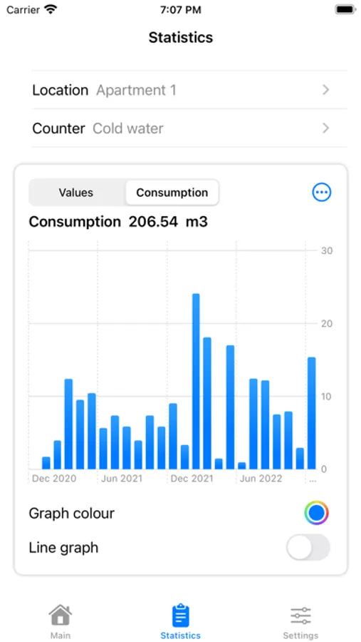 - The Chart visually represents previously entered measurements (more than two entered values are required to display the Chart). Select the meter's location and the meter itself to display the Chart. Switch between displaying input and consumption. The filter for displaying the number of meter readings, visualisation of the displayed values (when shown on the readings) and changing the graph type provide additional opportunities for analysing future costs.
