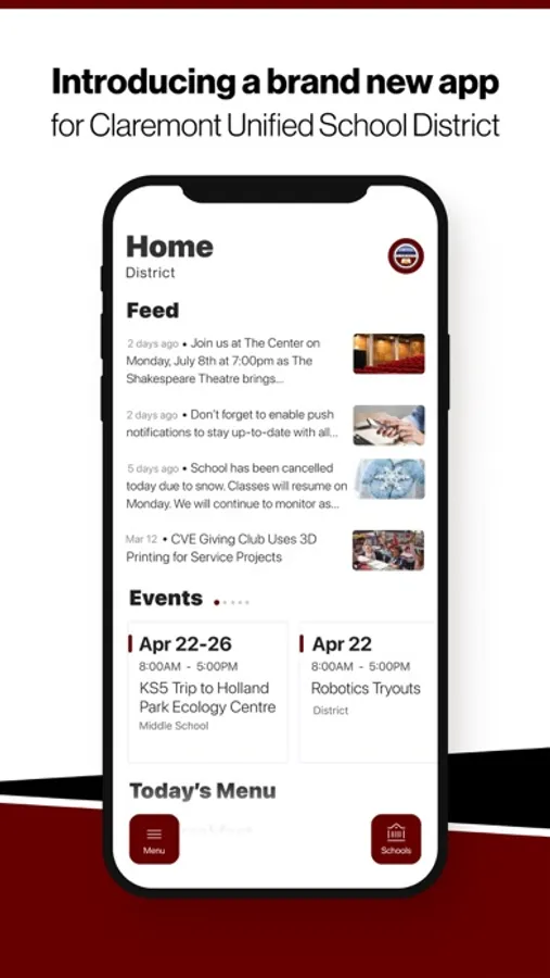 The event section shows a list of events throughout the district. Users can add an event to their calendar to share the event with friends and family with one tap.