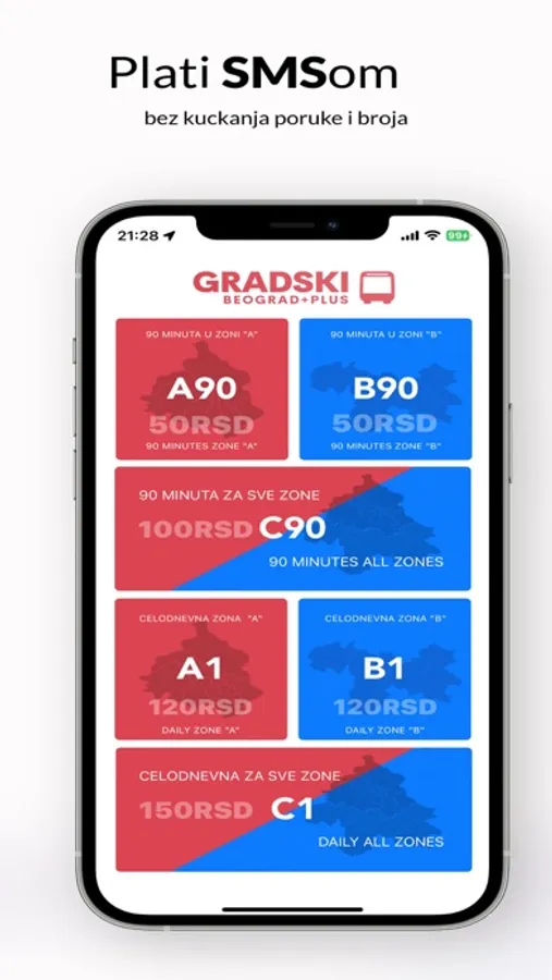 Save up time and facilitate the process of buying tickets. Without having to memorize different SMS codes. Simply tap a zone and duration for quick SMS shortcut for bus fare in Belgrade.