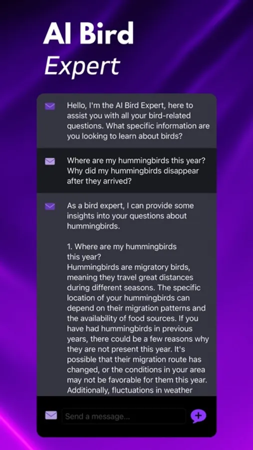 AI Bird Expert: Unleash the potential of our AI bird expert, capable of answering all your bird-related queries. Simply ask any question about birds, their behavior, habitats, or characteristics, and our expert system will provide you with accurate and reliable answers. Deepen your understanding of these magnificent creatures and unravel the mysteries of the avian world.