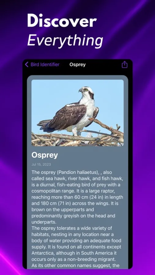 Extensive Bird Encyclopedia: Our app boasts an extensive database of birds, curated from reputable sources. Access detailed information about each identified species, including physical characteristics, habitat, behavior, and more. Expand your understanding and become an expert on a wide range of bird species.