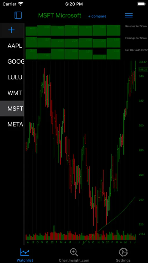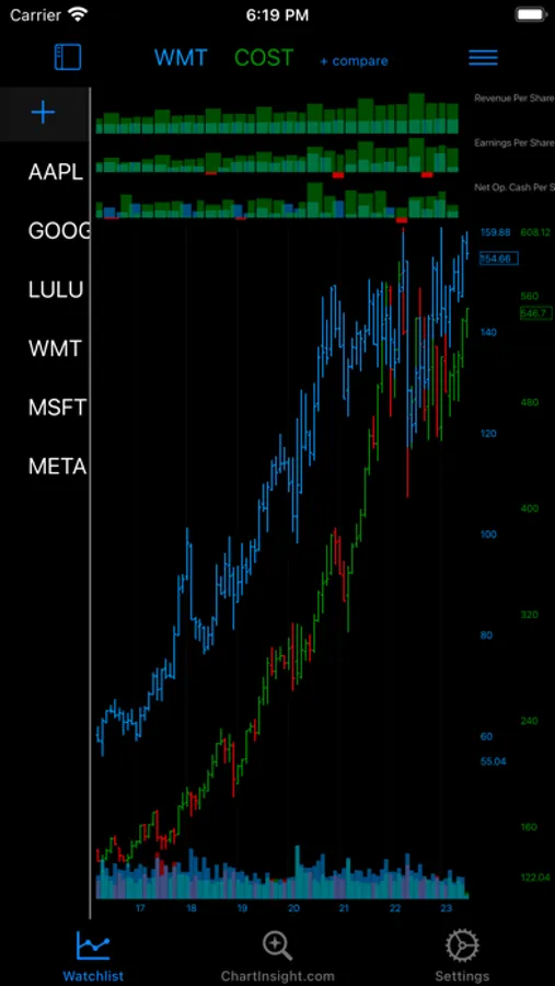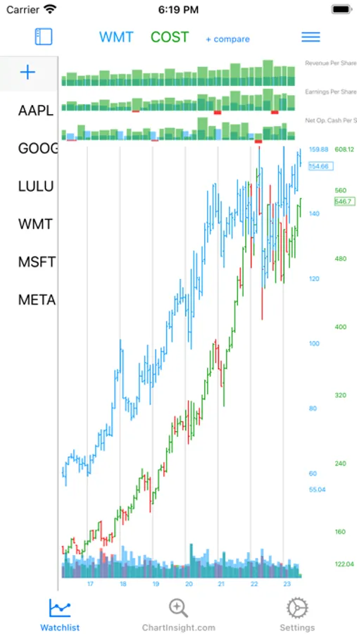 + Compare multiple stocks using candlestick charts, or a mix of close-only and candlestick styles