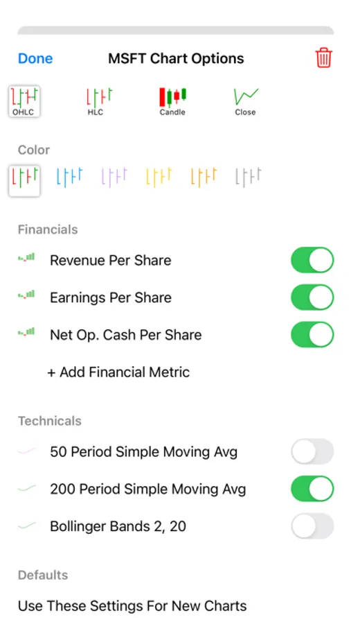 + Quickly flip though dozens of candlestick, OHLC, HLC and close charts in a variety of colors