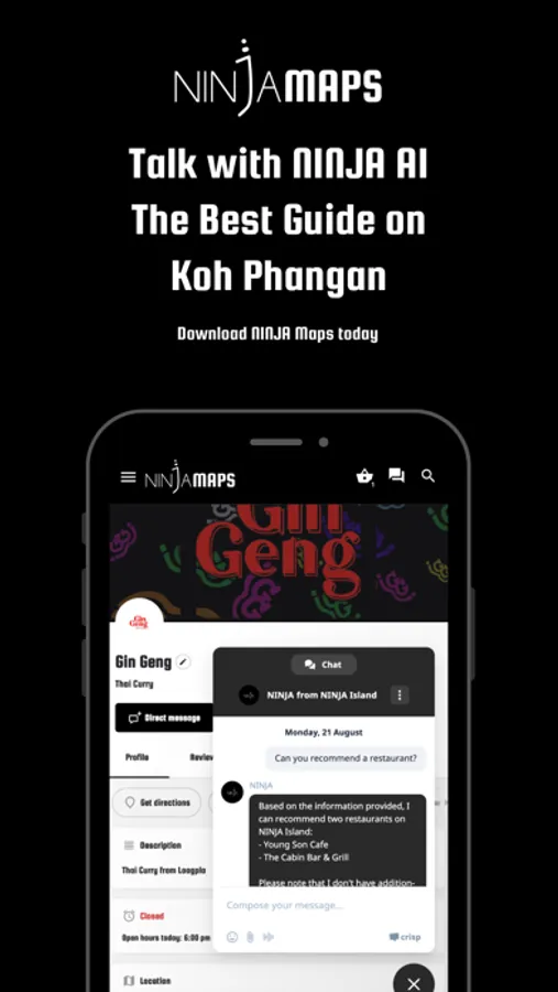 In addition, NINJA Maps is powered by NINJA AI, providing personalized recommendations based on your preferences and interests. The app also offers guidance and resources to help you discover and pursue your passions, making your stay in Koh Phangan not just a vacation, but a journey of self-discovery.
