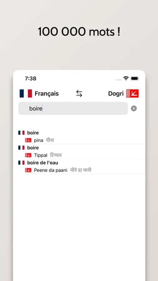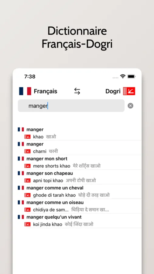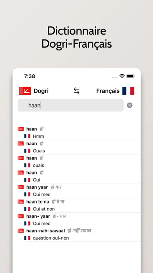 - Possibilité de rechercher à partir de mots en Français ou en Dogri