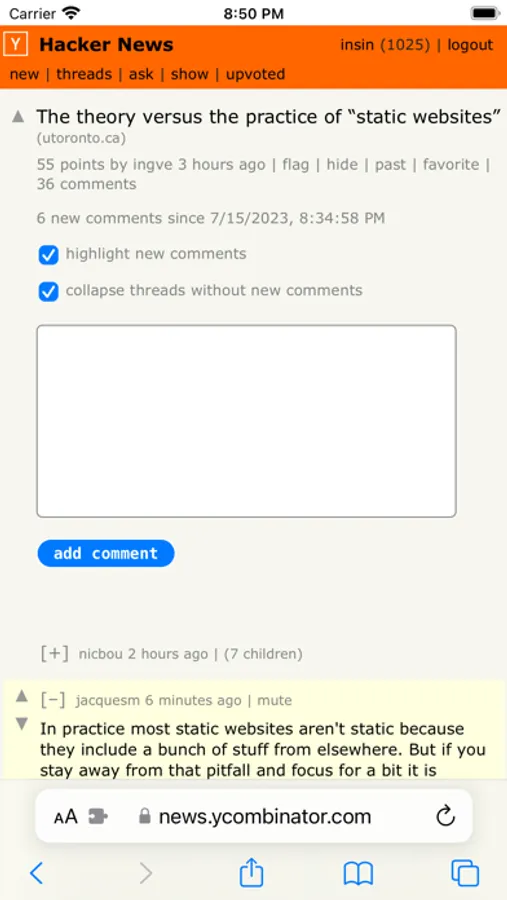 • Highlight new comments and collapse trees without any new comments when you revisit an item - you can configure whether or not this happens automatically when you revisit without using an "X new" link
